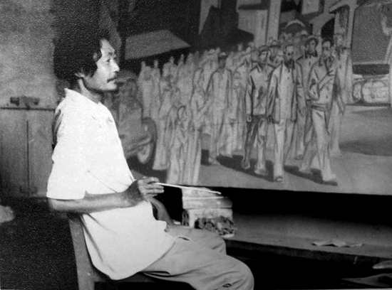 Họa sĩ Trọng Kiệm đang vẽ tranh “Bác Hồ thăm giai cấp công nhân ở Hà Nội”, 1985 (sơn dầu,